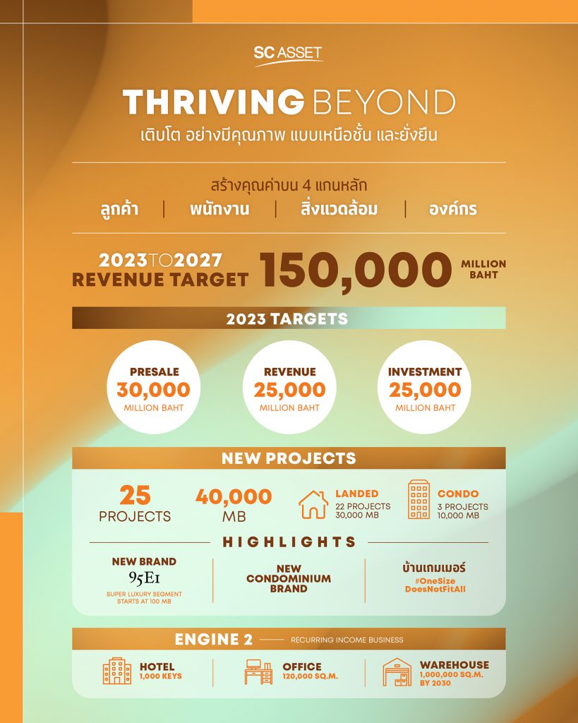 - สร้างรายได้รวม 25,000 ล้านบาท เติบโต 16% ทั้งจาก โครงการเพื่อขาย และธุรกิจที่สร้างรายได้ประจำ (Recurring Income) ในสัดส่วน 95 : 5 ตามลำดับ